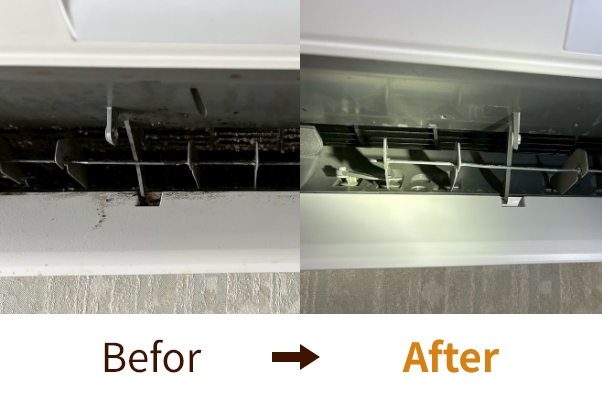 家庭用の壁掛けエアコンを分解し、内部のカビやホコリを高圧洗浄で徹底除去。